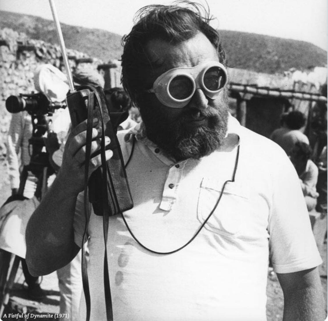At a smaller round table in the corner sat Leone. He wore motorcycle goggles with a wide brimmed hat and rested his hands on his belly. At his elbow was Ennio Morricone, whispering continually in his ear. I couldn’t hear what he was saying but occasionally there would be a moment when the carriage stopped clanking at the same time as the wheels stopped screeching and we could hear faint singsong mumblings. At first I wondered if Morricone was reminiscing about the days when, as a child, he would play the french horn in a brothel to earn money for his impoverished family. But the more I watched, the more I felt that the composer was talking to Leone about me. Leone would nod every once in a while, as Morricone, in his thick-rimmed dark glasses, stared steadily at me.